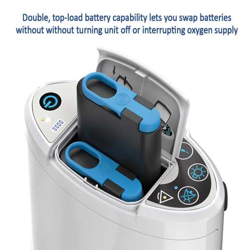 • Hot swap, top load batteries allow the oxygen user to switch batteries without turning the unit off or removing it from the bag.