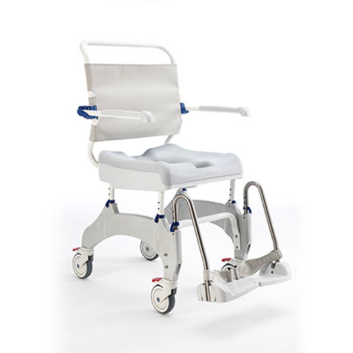 The Aquatec Ocean Ergo XL Shower and Commode Chair with Collection Pan, Lid and Pan Support Guide Rail, features ergonomic, height-adjustable swing-away armrests and footrests and angle-adjustable flip-up textured footplates with heel loops for security. Footrest height, seat height and footplate angle easily adjustable without tools for personalized fit. Innovative ergonomic seat encourages a more upright position for enhanced comfort and independence. Easily maneuvered in small spaces as well as allowing for a better fit over standard toilets for independent personal care.