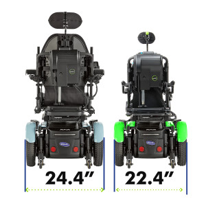 •Front casters are moved outboard to allow use of a center mount front rigging to help improve the comfort of the user. The center mount front rigging can tuck under up to 7˚
