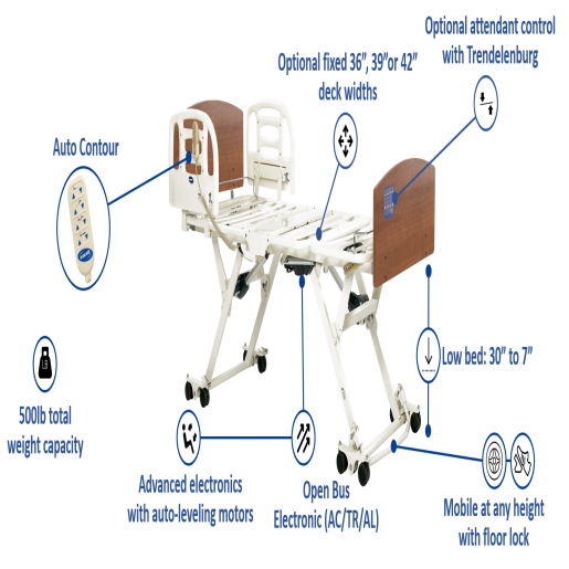 • Dual Pendant Connections - Pendant connects to either side of the bed, providing customized convenience for the user. Pendant cords are attached to the frame and will not interfere with lifts or tables