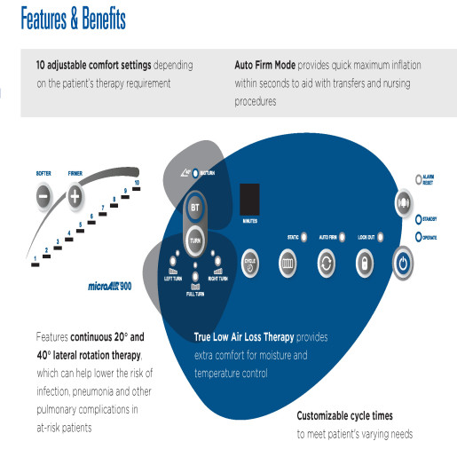 Lateral Rotation and True Low Air Loss in the microAIR MA900 Lateral Rotation Low Air Loss Mattress System help provide Pressure Relief and Moisture Management, with built-in Side Bolsters for added safety. This item number represents the PUMP ONLY.