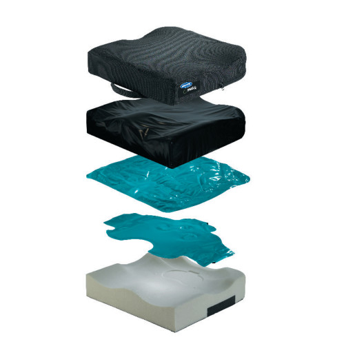 Hybrid wheelchair cushion provides gentle contour and optimal pressure redistribution. The Invacare Flovair Gentle Contour cushion captures the stability of foam, the pressure redistribution of air and the shear management of fluid all in one hybrid cushion. Zippered inner cover easily wipes clean and allows access for cushion modifications.